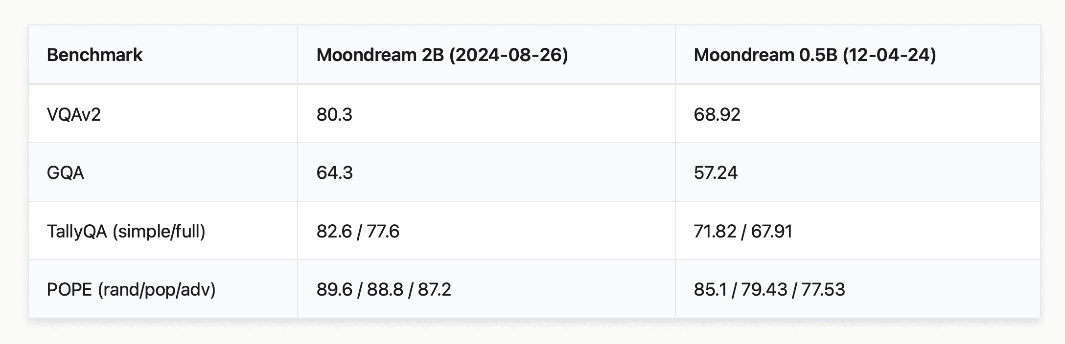 Moondream 0.5B’s diminutive size doesn’t compromise on utility. Here are the benchmarks: