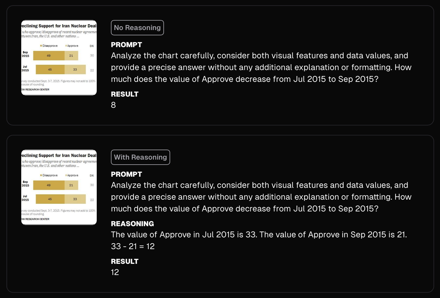 Take chart understanding, for example. Without reasoning, Moondream does its best by essentially guessing ths answer in one shot. With reasoning on, it breaks the job into three small steps, then nails the answer.