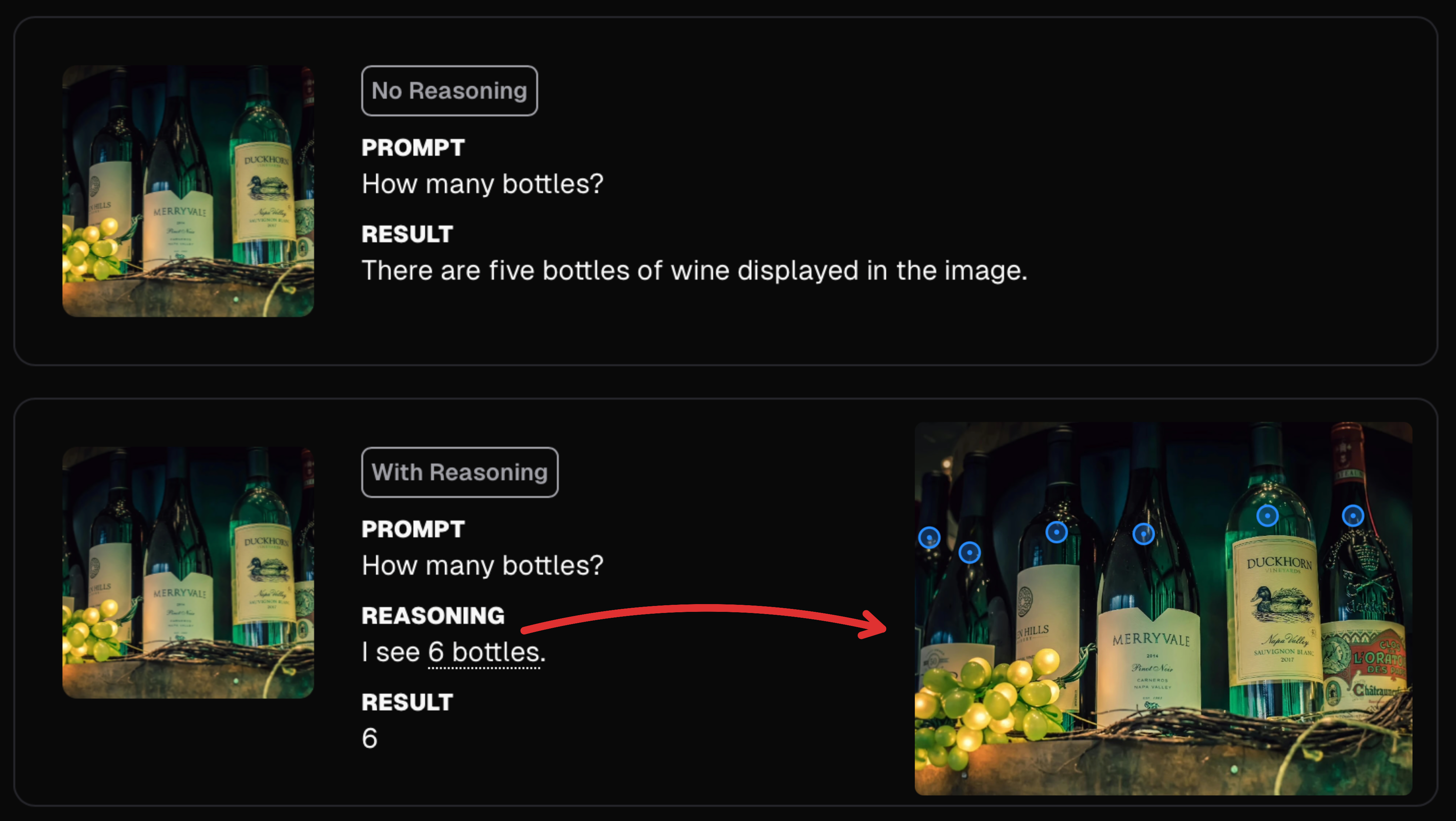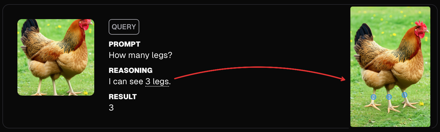 Moondream can now pause, look around the picture, and think step-by-step before answering. We call this grounded reasoning because the model can reason, using both logic and visual facts about the image to produce more accurate answers.