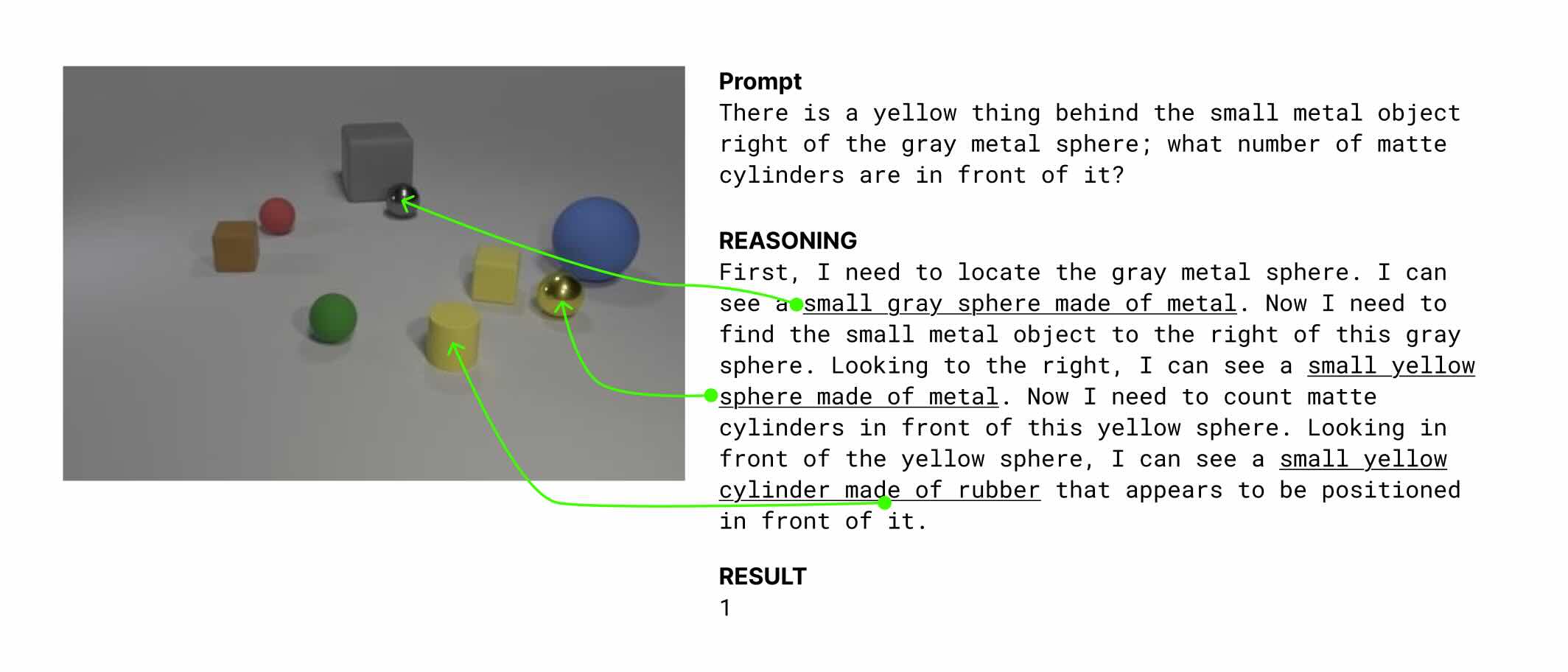 Each chunk of underlined text in the reasoning is grounded, meaning the model references a particular part of the image. In our playground, you can see what the model is focusing on by hovering over the text.