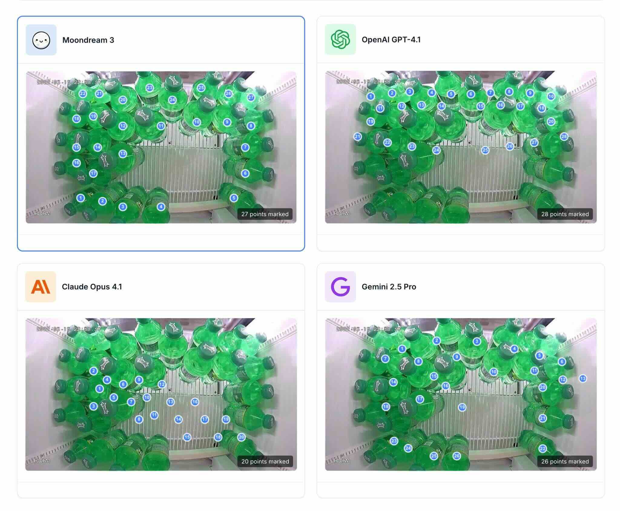 Like our last 2B release, this is a hybrid reasoning model that supports both reasoning and non-reasoning mode. Unlike other reasoning models, however, Moondream focuses on visual reasoning with grounding. Here’s an example of what that means: