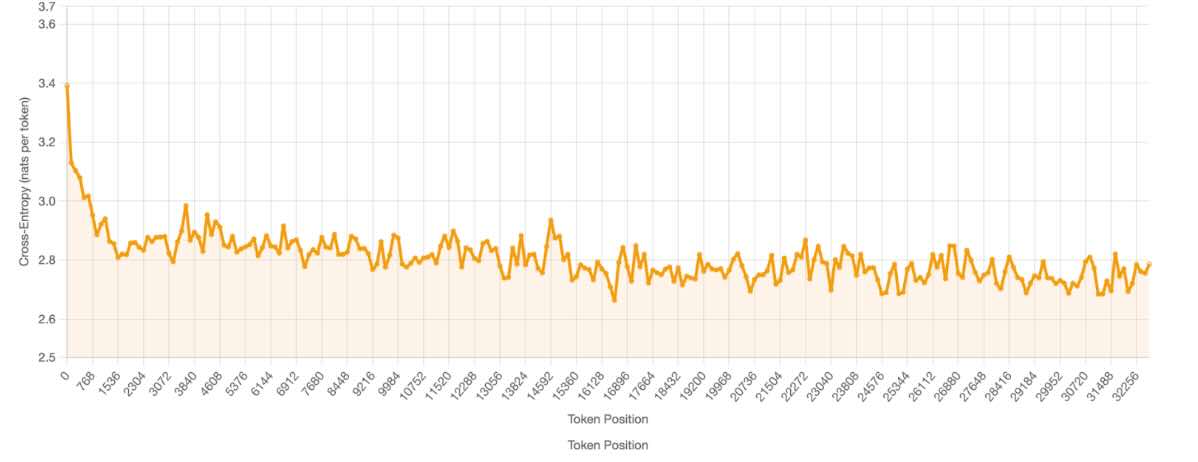 (Figure: Long-context perplexity evaluation on GovReport dataset. Each point shows the average cross-entropy loss (nats per token) for a 128-token sliding window at that position, measured across 100 documents truncated to 32,768 tokens.)